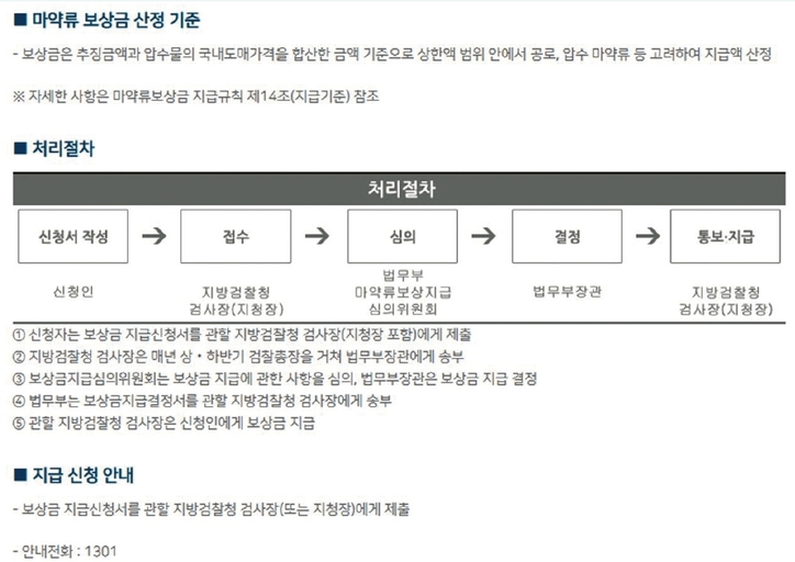 둘째, 검찰 처분 요건입니다. 보상금은 일반적으로 검사가 공소를 제기하거나 기소유예 처분을 한 경우에 지급됩니다. 다만 예외적으로 범인을 검거하지 못하고 마약류만 압수된 경우에도 보상금 지급이 가능합니다.