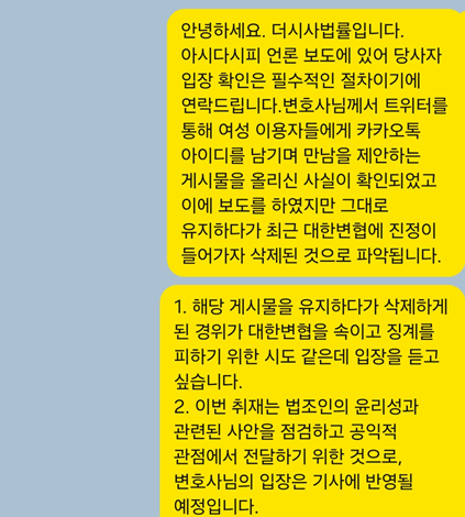 그러나 A변호사는 본지의 사실관계 확인 요청에는 응하지 않다가 대한변협에 진정이 접수된 뒤 조건만남을 암시하는 글을 삭제한 것으로 파악됐다.