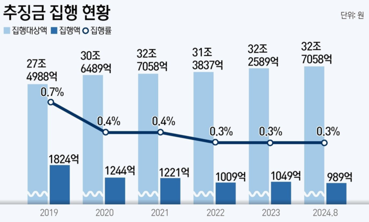 지난해 국회 법제사법위원회 소속 박균택 더불어민주당 의원실이 법무부로부터 제출받은 자료에 따르면 2025년 8월 31일 기준 범죄수익 추징금 집행대상액은 약 33조1800억원에 달한다. 반면 실제 집행된 금액은 878억3800만원으로 집행률은 1%에도 미치지 못했다. 사실상 환수 제도가 제대로 작동하지 못하고 있다는 평가가 나온다.