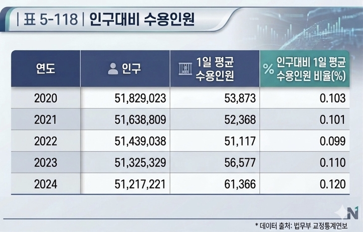 14일 법무부에 따르면 전국 교정시설 수용 정원은 5만614명인 반면, 1일 평균 수용 인원은 6만3060명에 달한다. 수용률은 124.6%로 정원 10명인 방에 13명이 생활하는 수준이다. 과밀 수용으로 인해 수용자 간 폭행뿐 아니라 교도관이 폭력에 노출되는 사례도 이어지고 있다.