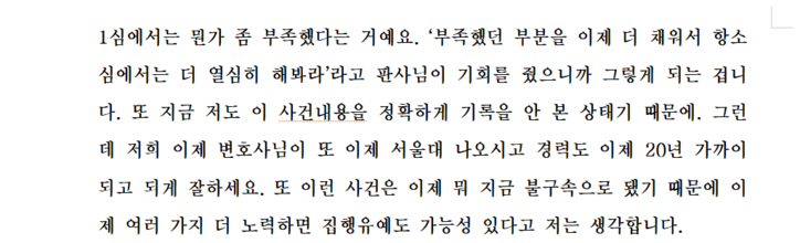 B씨가 제공한 통화 녹취에 따르면 ㅂ씨는 “우리 로펌에는 부장판사 출신 변호사가 있어 항소심을 전문으로 진행한다”며 “1심에서 부족했던 부분을 보완하면 집행유예 가능성도 있다”는 취지로 사건 수임을 권유했다.