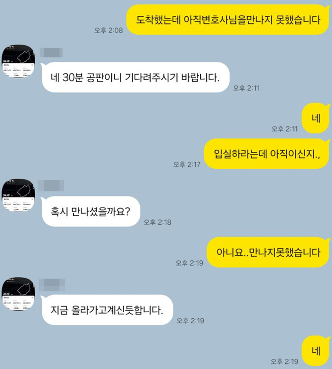 실제 재판 당일에도 B씨는 변호사를 만나지 못한 상태에서 입정했다. B씨가 제공한 카카오톡 대화에 따르면 변호사의 연락처를 모르는 B씨는 단톡방에 “변호사는 아직 도착하지 않았느냐”고 묻자 사무직원은 “만나셨느냐”고 되묻거나 “올라가고 있다”고 답하는 등 혼선이 이어졌다.