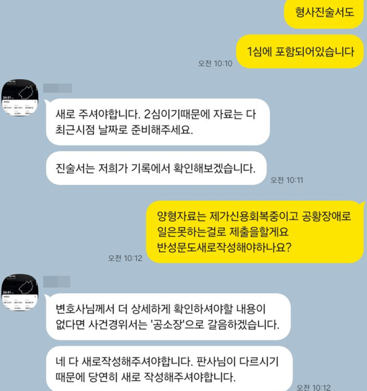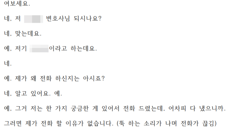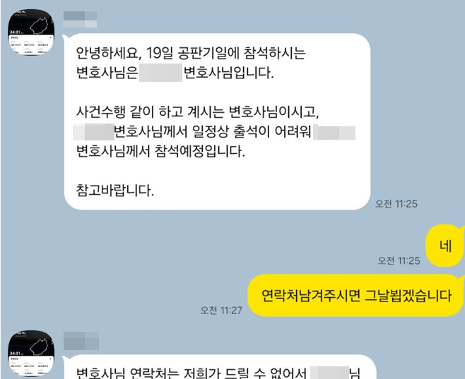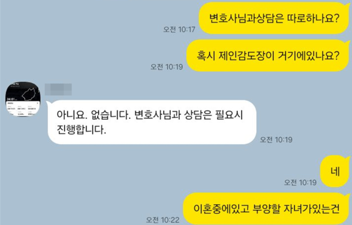 또한 변호사 연락처는 끝내 제공되지 않았고 재판 진행 전반이 사무직원을 통해 이뤄진 정황이 카카오톡 대화에서 확인됐다.