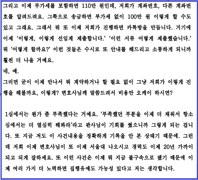 해당 제보자는 350만원의 착수금 가운데 150만원은 계좌이체로, 나머지 200만원은 현금으로 지급했다고 주장했다.