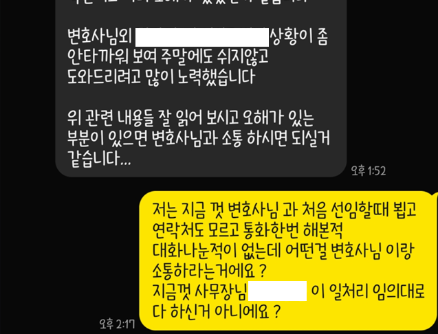 또 다른 제보자는 본지에 제보한 뒤 단체 대화방에서 문제를 제기하자 사무장들이 “앞으로 변호사와 직접 소통하면 된다”고 답했다.